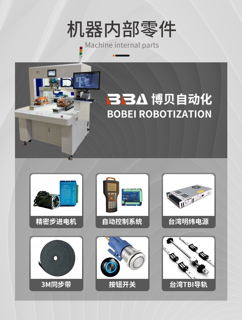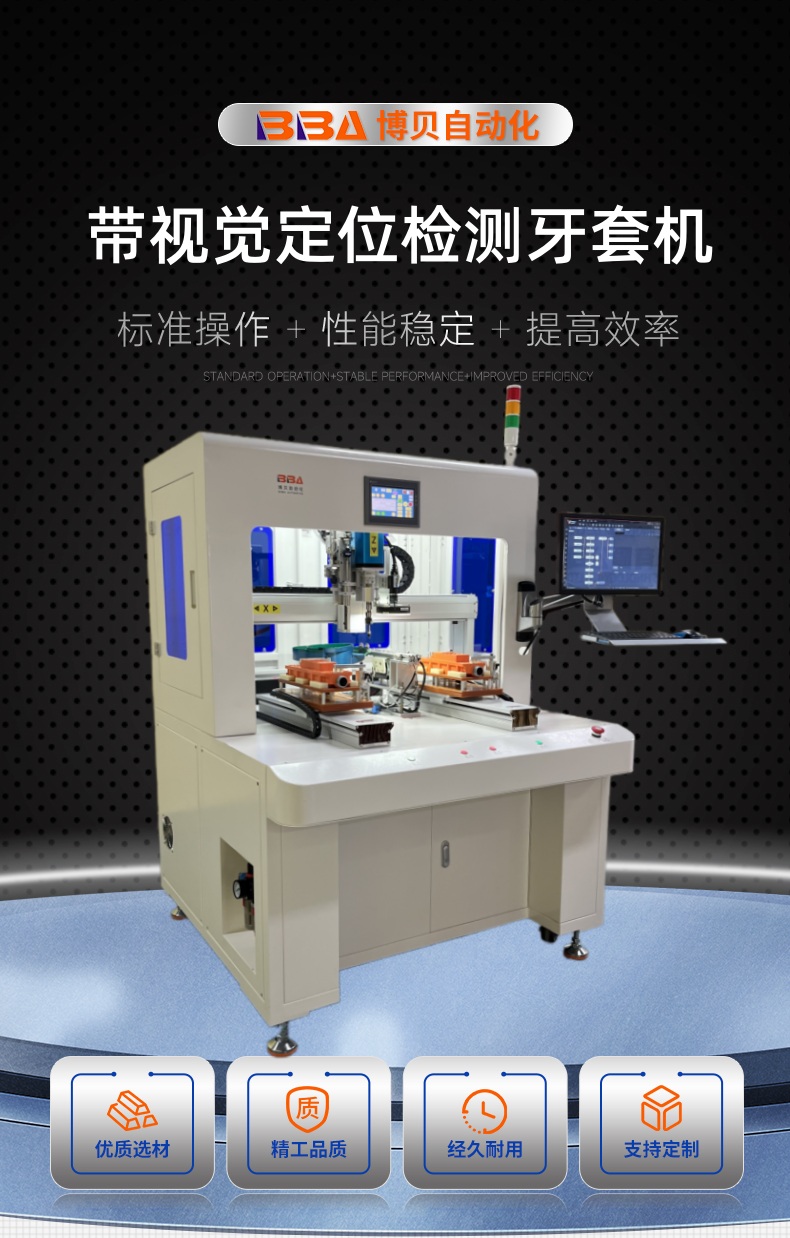 视觉引导高精度全自动螺旋螺套组装机 可编程螺套组装机,支持自定义螺套规格、组装参数 伺服驱动全自动螺套组装机,保障运行稳定性与精度 双工位全自动螺套组装机,交替作业提升效率博贝自动化,是专门从事自动螺纹牙套拧紧机,也称为牙套拧紧机,螺纹牙套自动安装工具。钢丝螺纹牙套拧紧机可以自动快速的将牙套精确地拧入产品,同时保证产品的质量。螺纹牙套自动拧紧系统自动拧紧系统振动盘+直振轨道供料,伺服电批拧牙取料,可分正反方向,自适用正反牙,依牙套量身设计。牙套入牙拧紧后自动退牙,可加点胶和深度检测功能,单头或双头作业。
