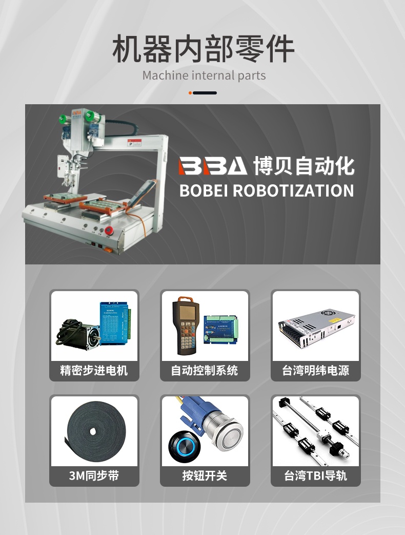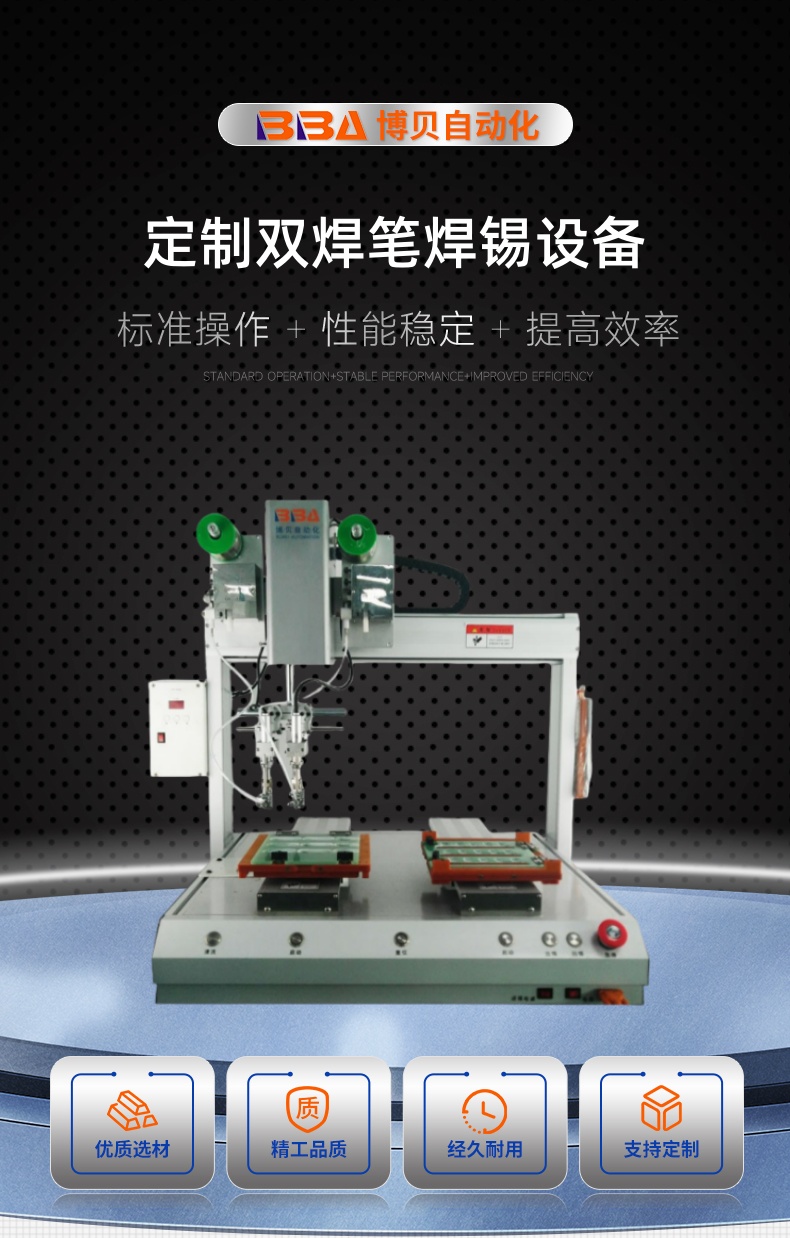 博贝自动化,是专门从事自动焊锡机机,自动焊锡设备,焊锡机器人的专业生产厂家。机器样式多样,亦可根据产品定制机型。有单工位,双工位,多工位,在线式,单头,双头及多头焊锡机供不同产品的自动焊锡的需求。更多信息,请咨询热线:18617279323