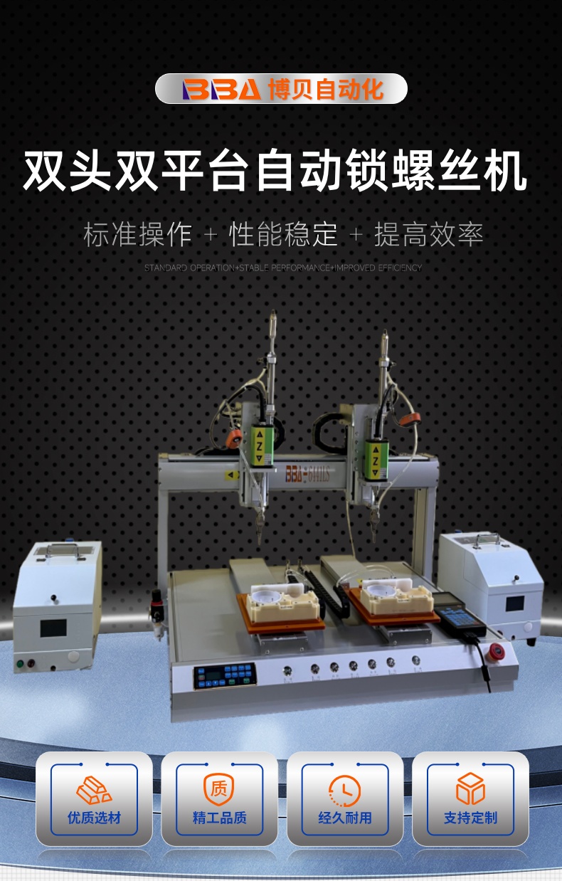 博贝自动化,是专门从事自动锁螺丝机,自动拧螺丝机,自动打螺丝机的专业生产厂家。机器样式多样,亦可根据产品定制机型。有单工位,双工位,多工位,在线式,单头,双头及多头螺丝机供不同产品的自动锁螺丝的需求。更多信息,请咨询热线:18617279323