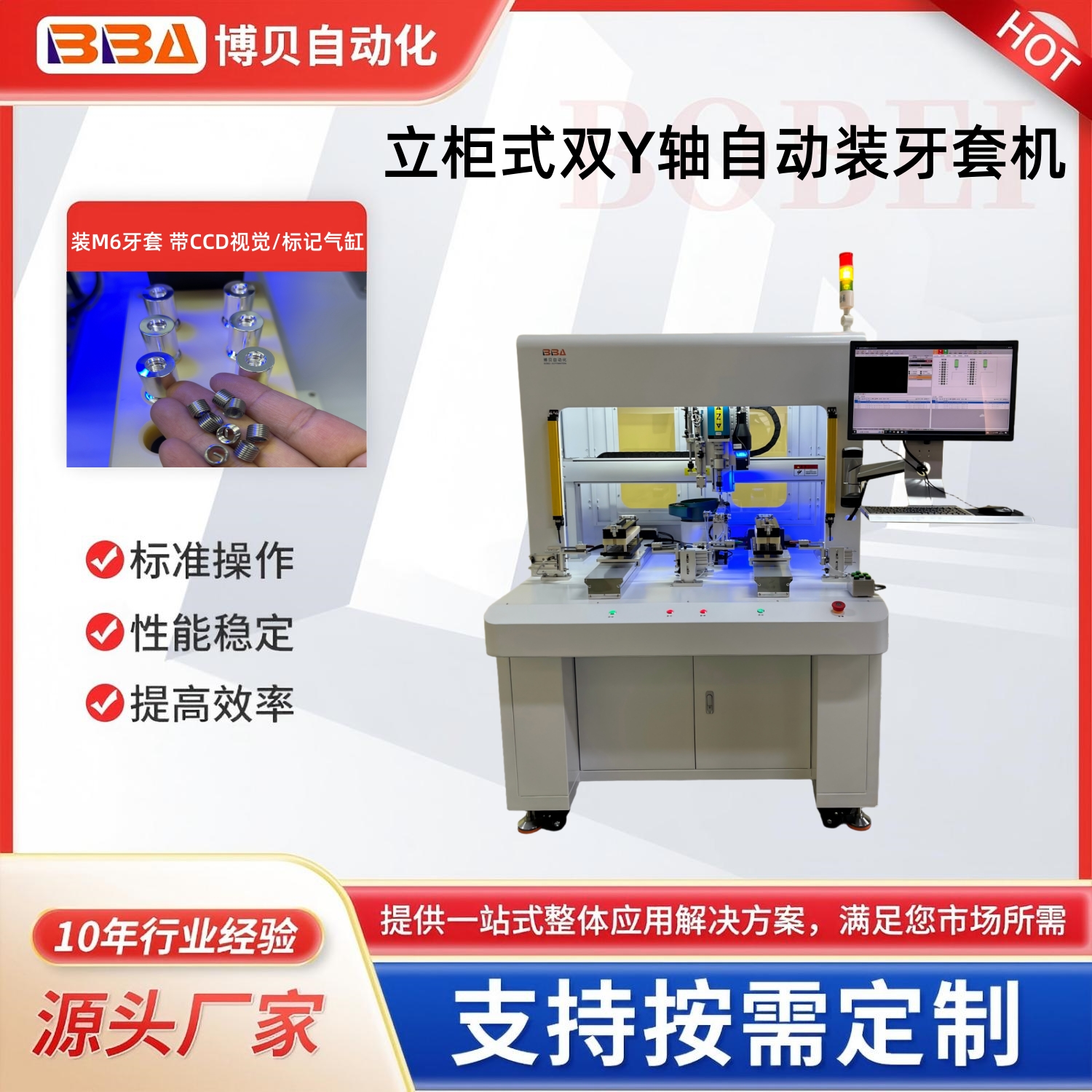 博贝自动化,是专门从事自动螺纹牙套拧紧机,也称为牙套拧紧机,螺纹牙套自动安装工具。钢丝螺纹牙套拧紧机可以自动快速的将牙套精确地拧入产品,同时保证产品的质量。螺纹牙套自动拧紧系统自动拧紧系统振动盘+直振轨道供料,伺服电批拧牙取料,可分正反方向,自适用正反牙,依牙套量身设计。牙套入牙拧紧后自动退牙,可加点胶和深度检测功能,单头或双头作业。